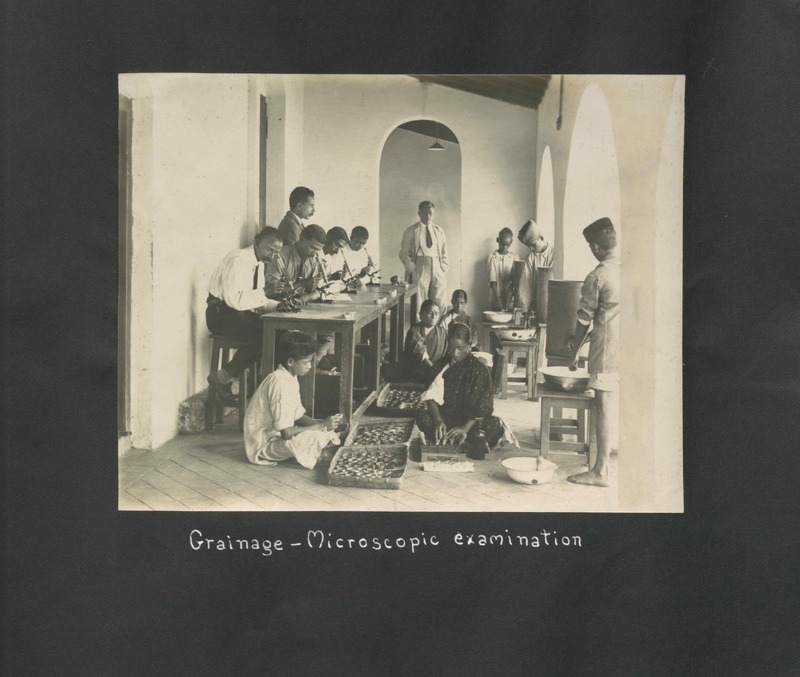 Grainage-Microscopic Examination, Mysore Sericulture DepartmentThis image is from a 1925 photo album (image no. 14 in the listed archival identifier) from the Mysore Sericulture Department in Mysore state, in India. The album showcases a diversity of images from the sericulture process, starting from the cultivation of silkworms, all the way to the production and packing of raw silk. The image is from a collection of material related to Leslie Coleman, a Canadian entomologist, who was initially hired by the Maharaja of Mysore to solve a pest problem in their areca plantations. During his time, he was instrumental in setting up agricultural practices and education, and also extending the sericulture work in the Mysore state. The album’s purpose did seem to be a demonstration of the entire process of running a silk farm. We can’t say for certain who is the photographer, or what prompted Coleman to keep this album (the Archives at NCBS does not have similar albums for other farming processes). But the album and Coleman’s collections are indicative of his cross-cultural moves across colonial empires, from Canada to Germany and eventually to Mysore, India. The object also showcases the technologies that had been established before the arrival of Coleman, in conversation with the Japanese in the late 19th century, including bringing in experts and machinery. This image has an innocuous sounding title, focusing on the 'Grainage-Microscopic Examination' that is integral to sericulture. But we also see the emergence of other societal themes. A group of men sit on chairs and peer at the microscopes; children and women sit on the floor tending to preliminary steps; and a supervisor-like man oversees the examination. This fragment prompts questions around the hierarchy of science, and brings to fore layers of gender, class, caste and labour that anchor sericulture work.