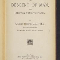 This volume is an American pirated edition of The Descent of Man by Charles Darwin, issued in the mid-1880s as part of The Humboldt Library of Science in New York. At the time, the United States did not recognise international copyright, allowing American publishers to reprint British works without paying royalties. Sold for as little as 75 cents (or $1.50 in cloth), this double-columned edition on cheap paper cost a fraction of the authorised John Murray copies imported from Britain, which retailed for $10. Its format reflects a deliberate attempt to make scientific works affordable to a broad readership.