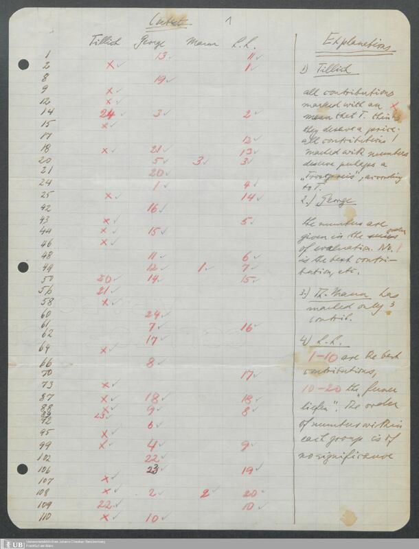 Handwritten evaluation sheet with the evaluation scores of the board (Max Horkheimer, Manfred George, Thomas Mann and Paul Tillich)