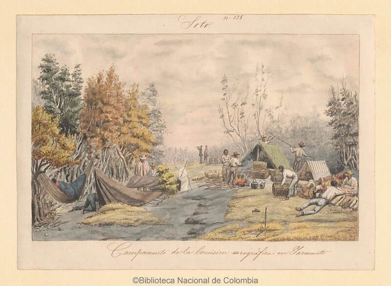 Camp of the Chorographic Commission in Yarumito, Colombia.This watercolor was created by Venezuelan Carmelo Fernández (1809–87), one of the three official draftsmen and painters of the Chorographic Commission, an ambitious Colombian enterprise to map the country, including its mineral resources, between 1850 and 1859. The Commission was led by the Italian born Agustín Codazzi (1793–1859), who involved members of his family: his wife Araceli de la Hoz served as de facto quartermaster, chief logistician, and hostess, while his daughter Constanza and her siblings assisted with reproducing maps. His sons Domingo and Lorenzo also participated in the group’s explorations. The Commission counted on interpreters, porters, muleteers, peons, baqueanos, all led by the butler José Domingo Carrasquel. The watercolor shows a character with a spyglass, presumably a naturalist, and the daily life of the camp, where it was necessary to cook, care for horses and mules, organize samples, notes and reports, as well as pitch and repair tents. Observations were not made in a vacuum, requiring numerous assistants, go-betweens, and wider support networks to make it possible to look, interpret, measure, and collect.