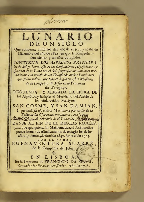 Lunario de un sigloBuenaventura Suárez (1679-1750), a Jesuit from Santa Fé (in present-day Argentina), spent most of his life as a missionary in the Río de la Plata Basin, where he composed these lunar ephemerides, published in Lisbon in 1748. This specific copy is a poignant reflection of the social structure within what would become the largest Jesuit mission in history, ultimately destroyed during the Guaraní Wars in the mid-18th century. Returning to South America, initially the copy belonged to Suárez himself, and later it was owned by Juan Sixto Mbiti, the Guaraní deputy "corregidor" of the village of San Lorenzo Mártir, in what is now Brazil. Besides having been written in Paraguay, printed in Lisbon, sent back to the author, and finally passing into the hands of a Guaraní official—knowledge in circulation in a most literal sense—the book includes a century-long lunar calendar and eclipse canon, along with the longitude differences between various major cities worldwide and the small locality of San Cosme, which effectively becomes the "center" of the world.