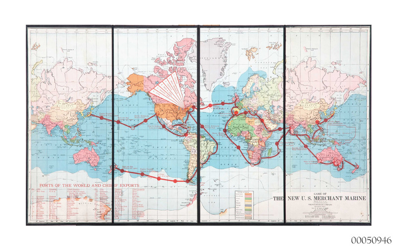The Game of the New U.S. Merchant MarineThis game was developed as part of the publicity campaigns to build the "shipmindedness" of the modern United States under the auspices of the U.S. Shipping Board. This civilian board oversaw the massive ship building program of 1917–20 to support the entry of the U.S. into WWI; after the Armistice it promoted a maritime vision of the modern world. Geographical and economic games were an established genre in the 19th and early 20th century. This game is noteworthy for its promotion of technological change and the modern conditions of shipping—it was the opposite of nostalgic visions of geographical exploration or the dangers and adventures of a sailor's life.