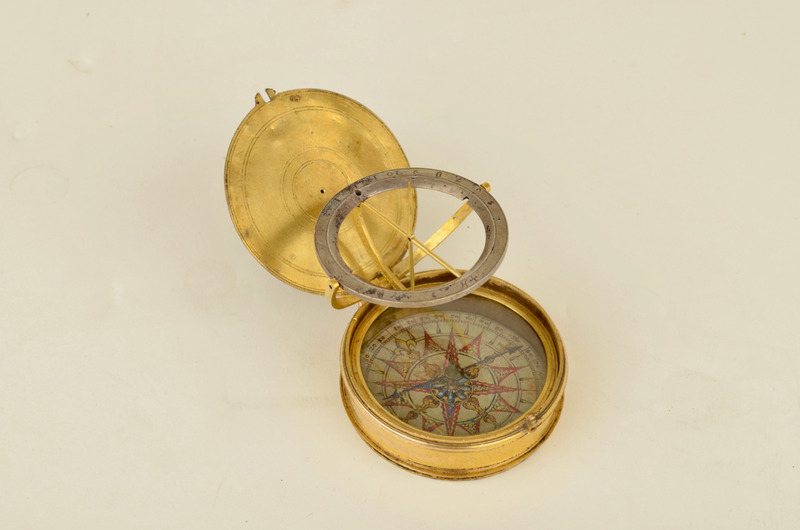 Pocket Compass Sundial, SpanishAs with all pocket sundials, this instrument is made for travel. It carries a compass needle so that it can be aligned north-south, and its outer casing is engraved with the latitudes of many major European cities so that its shadow-casting gnomon can be adjusted as its owner moves. The predominance of Iberian cities in the latitudes list, and the presence of Antwerp as one of the four cardinal cities of Europe, suggests that it is Spanish-made and pre-dates the protestant reformation of Antwerp in the late 1560s. A second set of evidence points to the instrument’s global travels. The underside of the dial’s case has been heavily modified by a second artisan sometime after its original manufacture. A second set of city latitudes has been added, in a less assured hand. Remarkably, all of these cities are in the ‘New World’, and include both major Caribbean, Central, and South American cities (Havana; Mexico City; Lima; Quito), as well as many smaller and more obscure cities from across the north and west of the continent. Research links many of these cities to Spanish mining concerns; and so the dial appears to have been modified for use by a Spanish conquistador. Because this second latitude list cannot be matched to any known atlases or geographical texts in Spain, it is plausible that these modifications were made by an artisan working in Central or South America.