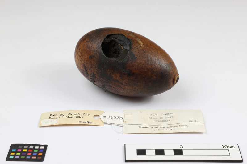 Medicinal “aloes” are made from the leaf gel of several different species of the plant. The drug is a black colour and looks rather like the resin of a tree. The first image (Cat. no. 36522) shows Aloe perryi from Socotra, a small island off the coast of Yemen. These aloes were considered the best for medicinal use from at least the 1st century until the 19th century. The second image (Cat. No 36520) shows aloes from the Caribbean. These aloes come from the plant now known as Aloe vera. Both these types of aloe circulated internationally, but their packaging reflects the specific technologies and environments of the places where they were produced.